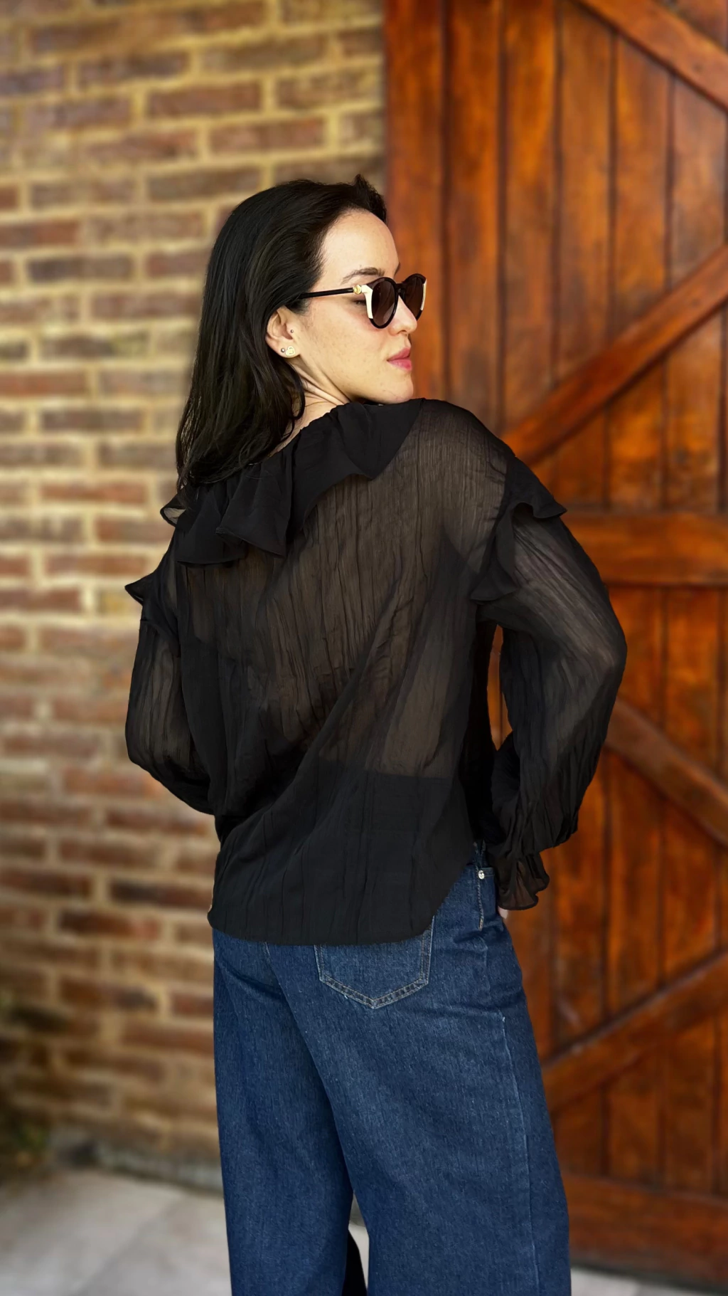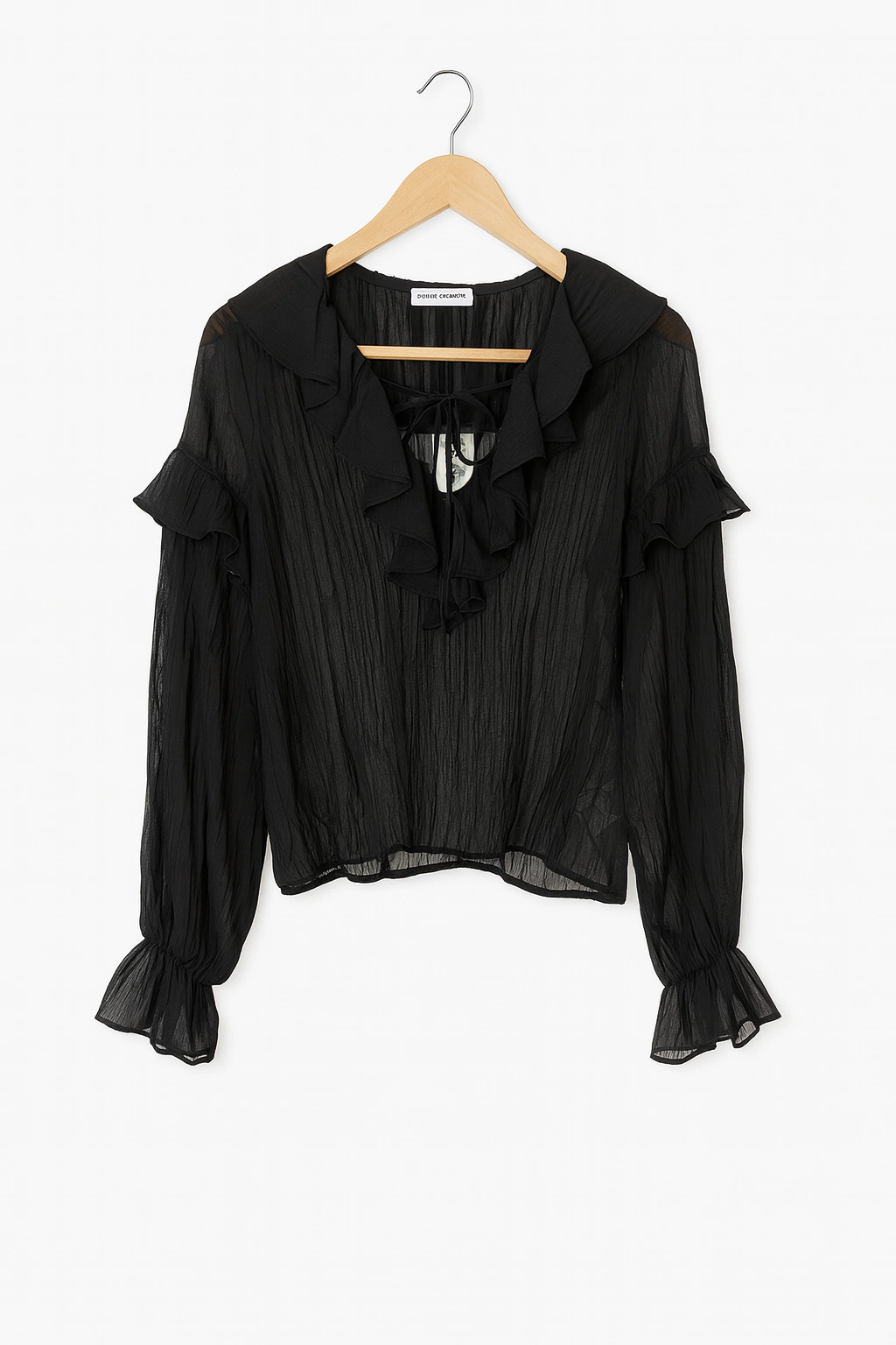 Esta blusa presenta un diseño de volados pronunciados en el escote, acompañados por una amarradura frontal que agrega un detalle delicado a la prenda. Está confeccionada con mangas largas con puño amplio fruncido, que aportan un efecto fluido y femenino. El calce es suave, holgado y recto, permitiendo que la caída del tejido resalte su textura plisada natural. Su largo llega a la altura de la cadera, ideal para usar por dentro o por fuera del pantalón.