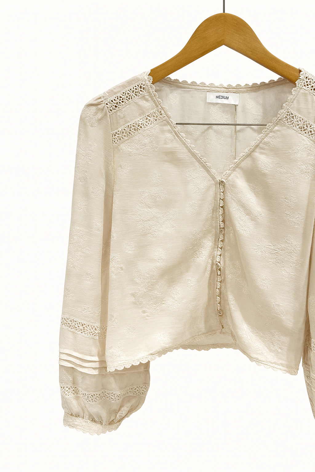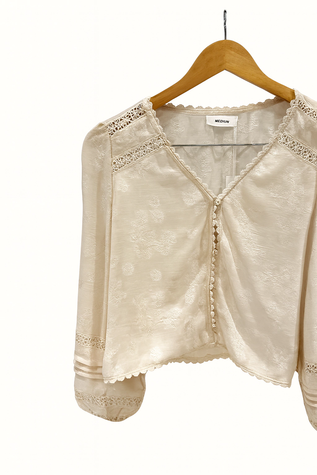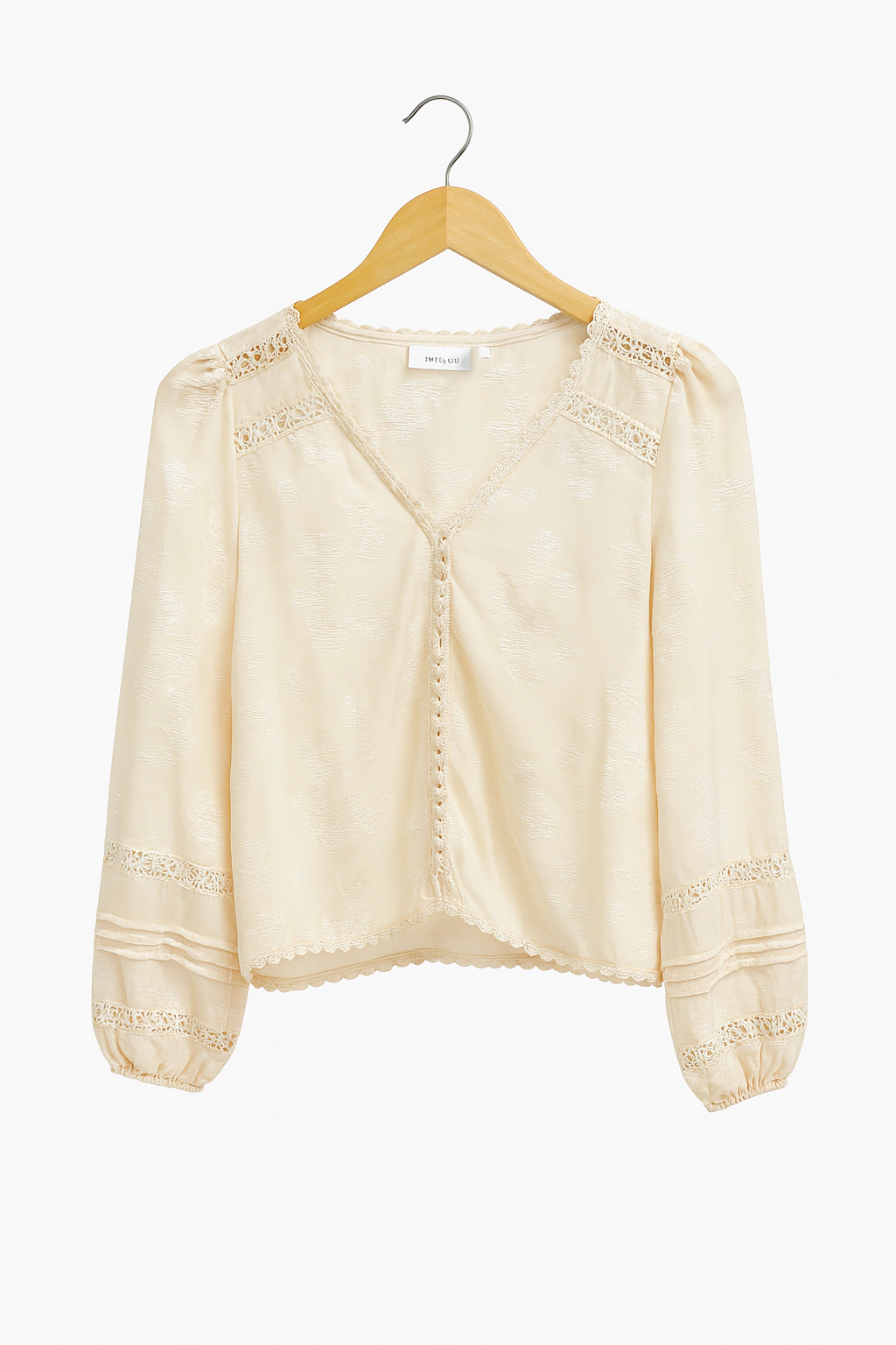 Esta blusa presenta un diseño texturado en tono negro, con un escote en V delicado, tapeta con botones forrados al frente y detalles de encaje en hombros y mangas que elevan el estilo. Sus mangas largas con puño fruncido y terminación con puntilla le dan un aire sofisticado y femenino. El calce es holgado y cómodo, con una caída suave que acompaña la silueta sin ajustar. El largo llega a la cadera, ideal para usar por dentro o por fuera del pantalón.