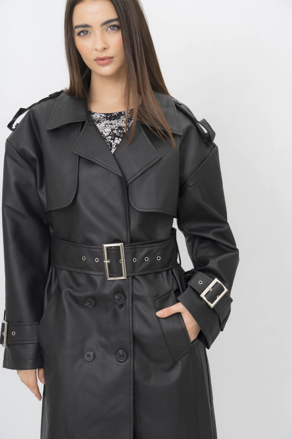 Los detalles en doble botonadura y mangas con hebillas aportan un toque de distinción, mientras que el corte largo y la textura del ecocuero le dan una apariencia atemporal. Ideal para salidas formales o ocasiones especiales, la Campera Ecocuero Emily es perfecta para revender.