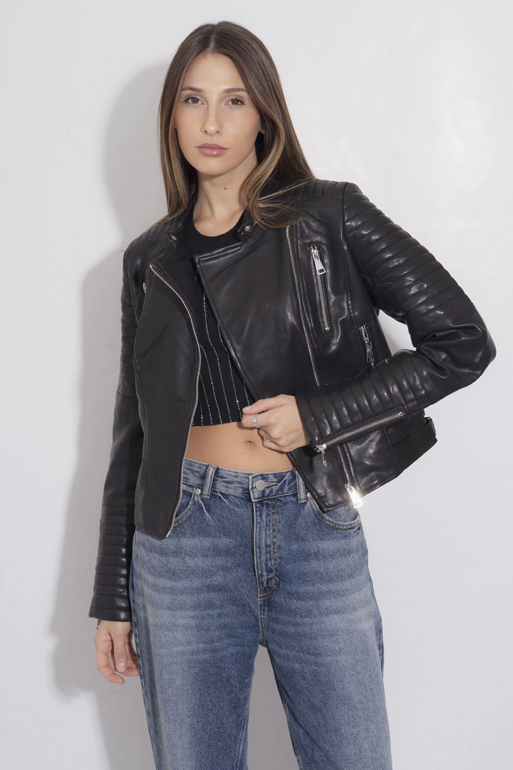 Su corte entallado resalta la silueta y su interior forrado brinda una experiencia de uso cómoda y práctica. Una prenda versátil que combina diseño contemporáneo y estilo biker, perfecta para looks urbanos con actitud.