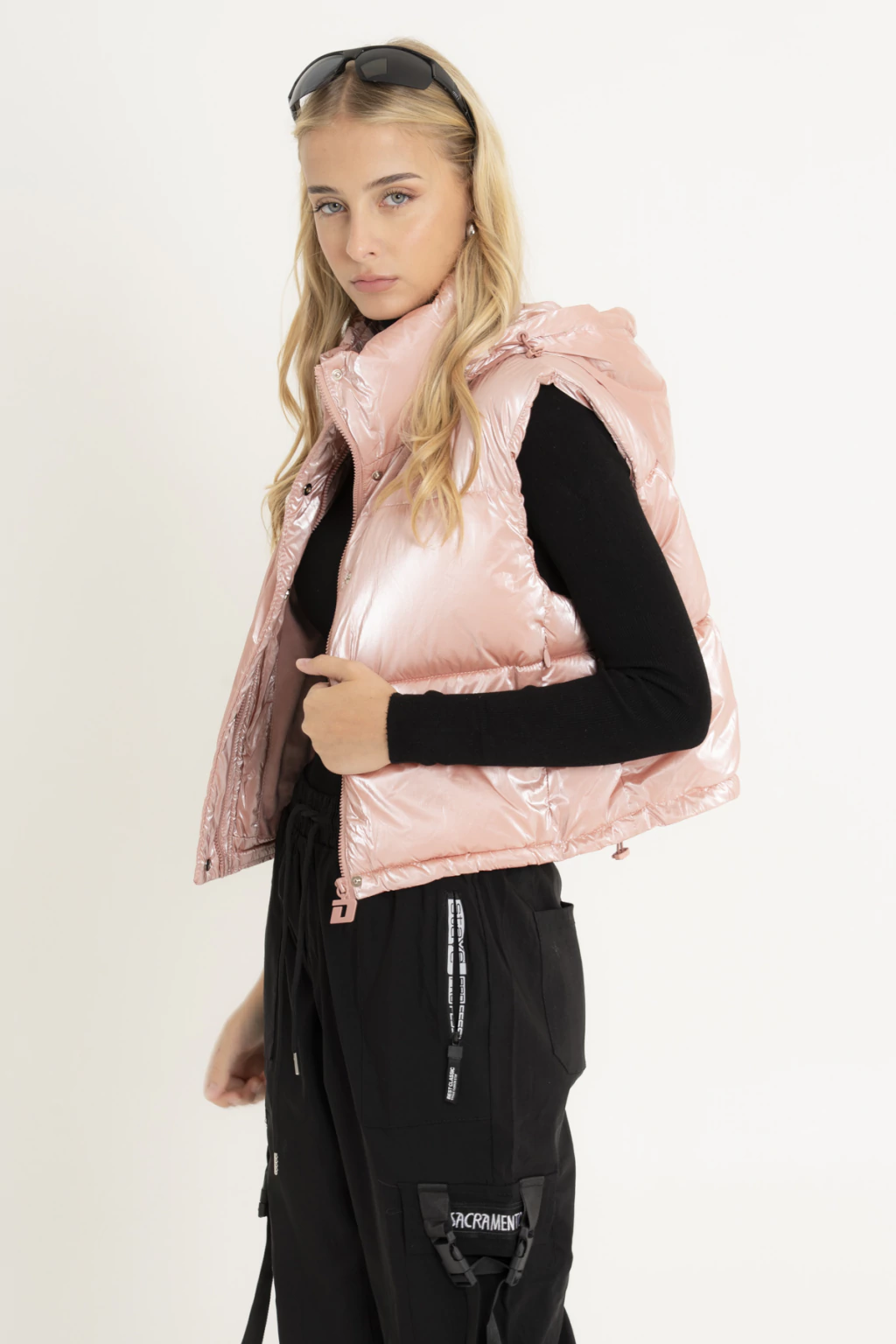 El cuello alto esconde una capucha plegable, perfecta para protegerte en días de viento o llovizna sin alterar el diseño. Su formato sin mangas otorga libertad de movimiento, ideal para superponer sobre buzos o sweaters, y el cierre con broches frontales asegura un calce perfecto.