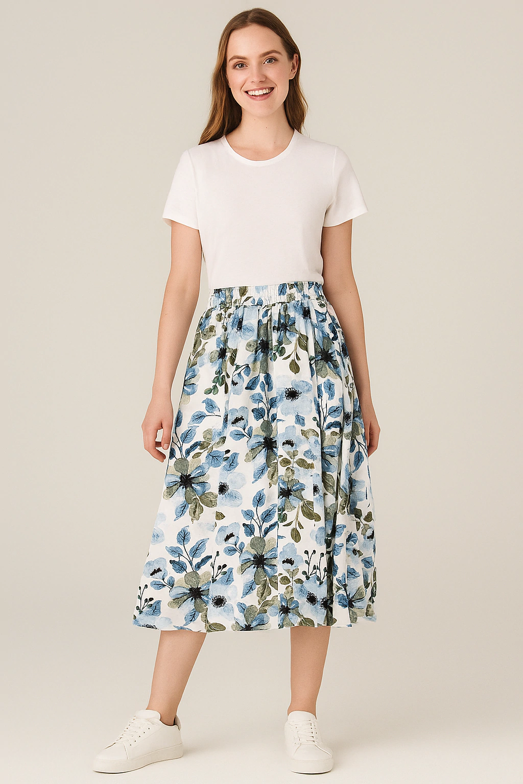 La amplitud de la falda permite libertad de movimiento y un andar natural, acompañada por un estampado de flores que le suma un aire distintivo y femenino.