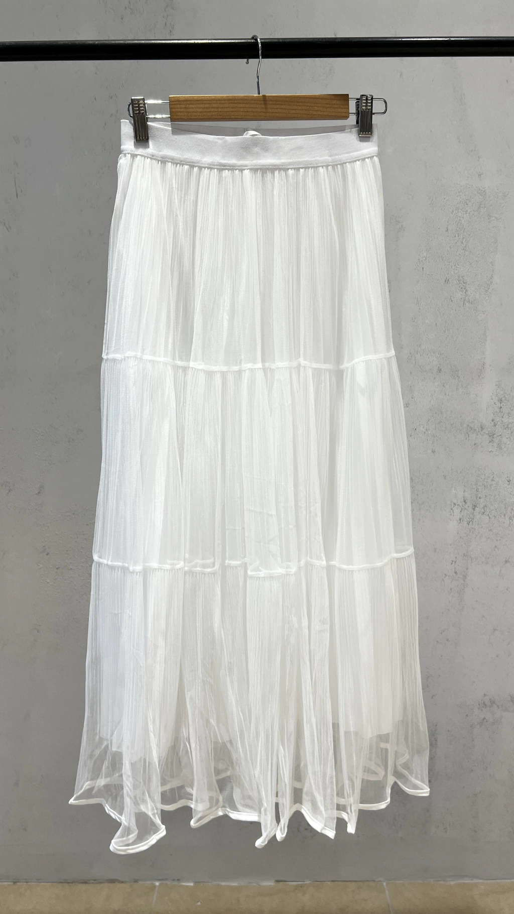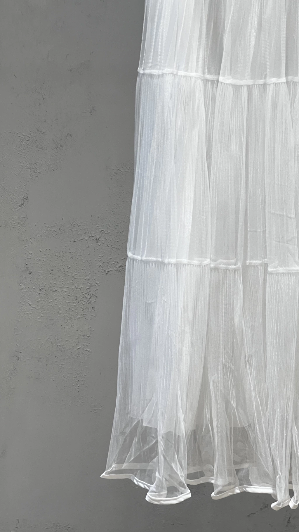 Falda larga de tul plisado en capas, con un diseño liviano, vaporoso y con caída amplia y fluida. Cintura alta y elástica, sin cierres ni botones, lo que garantiza un calce cómodo y adaptable a distintos cuerpos. El largo llega al tobillo, con un look voluminoso pero liviano que genera movimiento al caminar. Ideal para lograr un estilo impactante sin sacrificar comodidad.