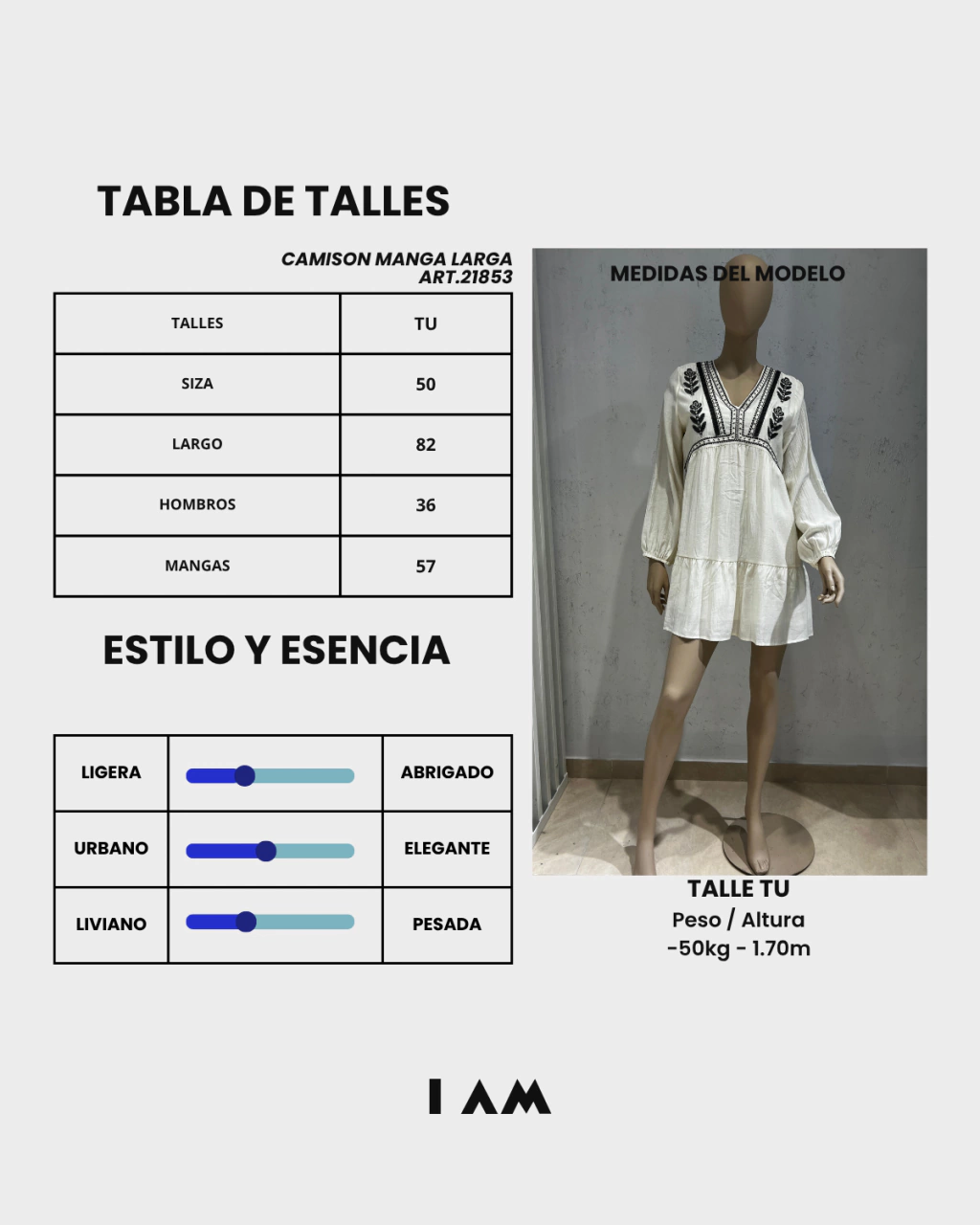 Su diseño destaca por el corte suelto y ligero, con mangas largas abuchonadas, terminaciones elásticas en los puños y un detalle bordado frontal en forma de espiga que aporta un toque artesanal y elegante. El escote varía entre redondo y en “V” profundo, generando versatilidad en la misma línea. El ruedo con volado amplio suma movimiento y fluidez a la silueta.