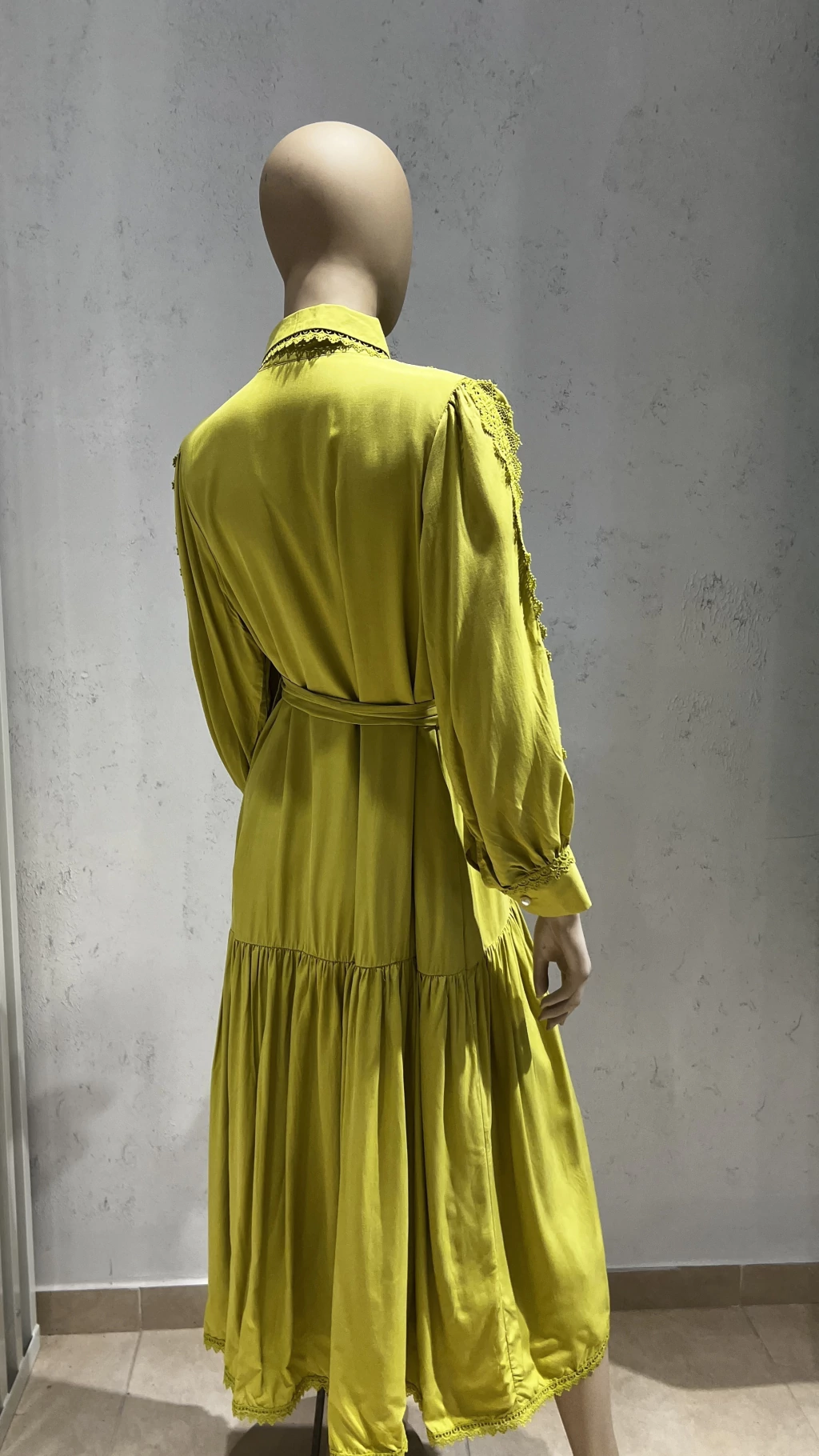Su diseño combina un corte largo con falda amplia y fluida, mangas largas con terminación en puño, botones delanteros estilo perla y un cinturón a tono para ajustar la cintura. Los detalles de puntilla bordada en mangas, escote y contorno realzan su estilo delicado, aportando un acabado elegante y artesanal.